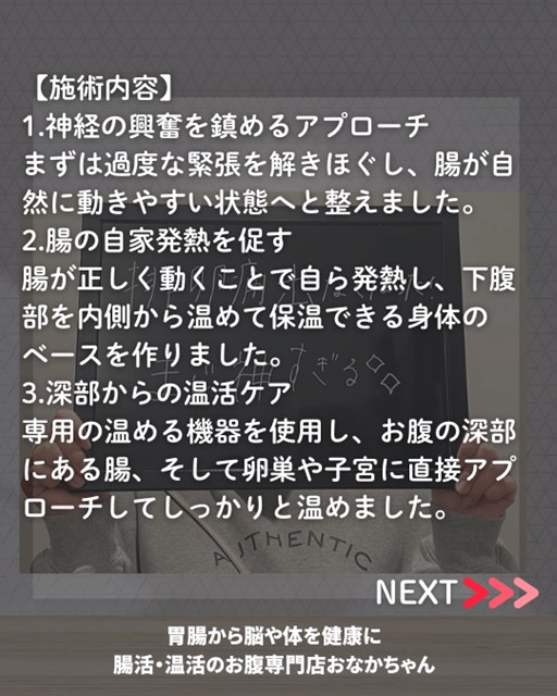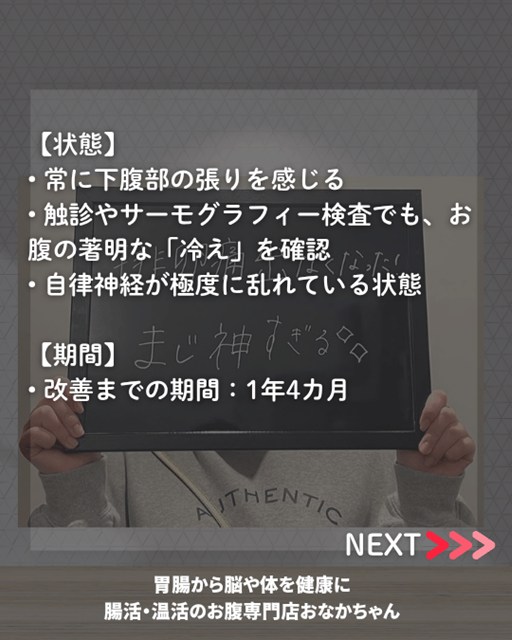 2. 腸の「自家発熱」を促す 腸が正しく動くようになると、内臓自体が熱を生み出すようになります。これにより、下腹部を自らの力で温め、保温できるベースを作っていきました。