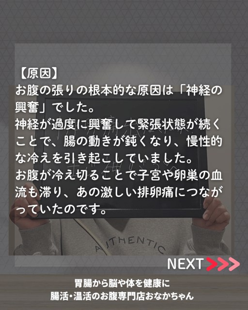 こちらのお客様の場合、お腹の張りの根本的な原因は「神経の過度な興奮」にありました。自律神経が乱れて常に緊張状態にあると、腸の働きが鈍くなり、血流が滞ってしまいます。その結果、骨盤内(子宮や卵巣の周辺)が冷え切り、激しい痛みにつながりやすい環境が作られていたと考えられます。