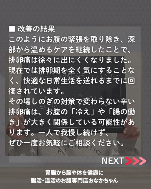 「神経の鎮静」「腸の働きの正常化」「深部の温活」を根気よく続けた結果、お腹の冷えや張りが改善していくとともに、排卵期の痛みも徐々に出にくくなっていきました。