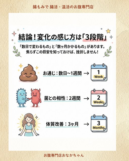実は、腸活の効果が出るまでには**「体のメカニズムに沿った明確なタイムライン」**が存在します。これを知らずに「効果がない」とやめてしまうのは、あまりにももったいない!