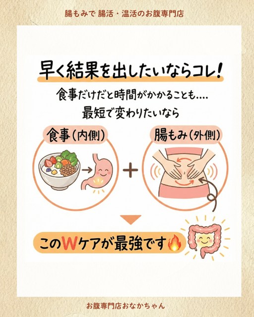 そんなあなたにおすすめなのが、食事(内側からのケア)にプラスして行う**「腸もみ(外側からのケア)」**です。