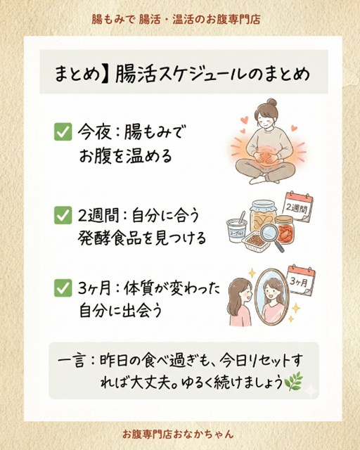 | 2週間 | 相性確認期 | 🦠 菌との相性チェック 食べている発酵食品が自分に合っているか判断できる時期。 |