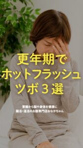 もし、冷えやむくみも気になる場合は、以前ご紹介した「更年期の冷え・むくみ対策(三陰交・太谿)」の記事も参考に、その日の自分に必要なツボを選んであげてくださいね。