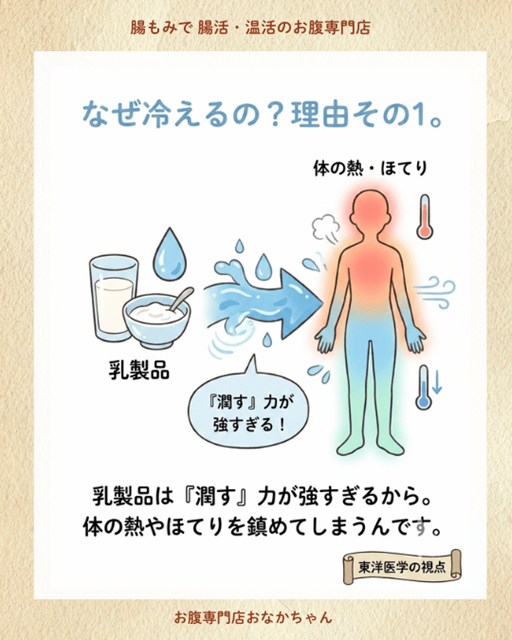 東洋医学では、食材には体を温めるものと冷やすものがあると考えます。ヨーグルトの原料である牛乳などの乳製品は、体液を補って「潤す」働きに優れています。しかし、これが効きすぎると、結果的に体の熱やほてりを鎮め、体を冷やしてしまうのです。