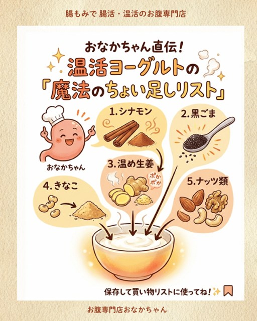 冷蔵庫から出して少し常温に戻すか、レンジで人肌程度に温める「ホットヨーグルト」にするのが基本。さらに、以下の**「カラダを温める食材(温性)」**をちょい足しするだけで、冷えない「温活ヨーグルト」に早変わりします!