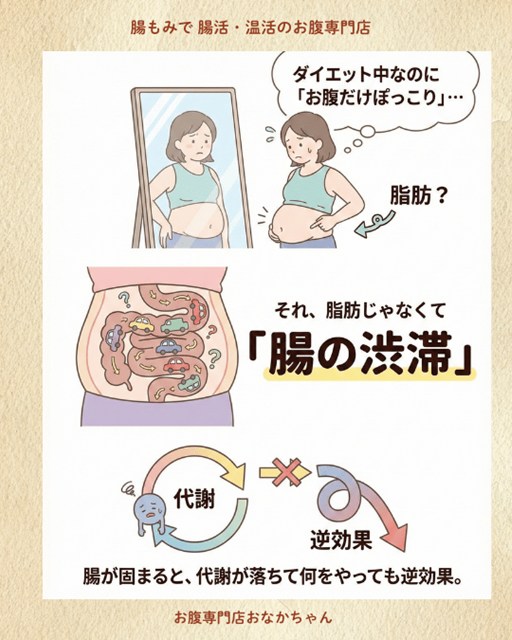 ダイエット中なのに結果が出ない場合、腸がカチカチに固まって動きが鈍くなっている可能性があります。腸の働きが滞ると、不要なものが溜まりやすくなり、結果としてお腹がぽっこりと前に出てしまうのです。