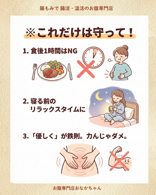安全にケアを行うために、以下のタイミングや状態の時は腸もみを控えましょう。