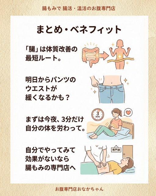 「腸」を整えることは、健康的な体質改善への近道です。 まずは今夜、たった3分だけ自分の体に触れて、労わる時間を作ってみませんか?明日から、お気に入りのパンツのウエストに少し余裕ができるかもしれません。
