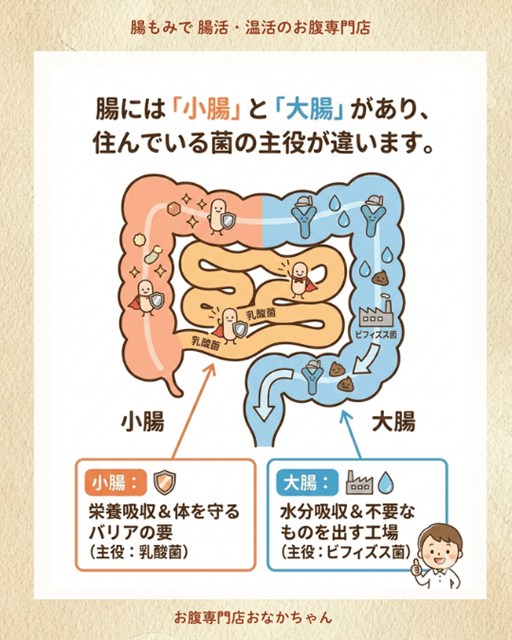 私たちの腸は大きく分けて**「小腸」「大腸」**の2つがあり、それぞれ住み着いている善玉菌の「主役」も、担当している「役割」も全く違います。