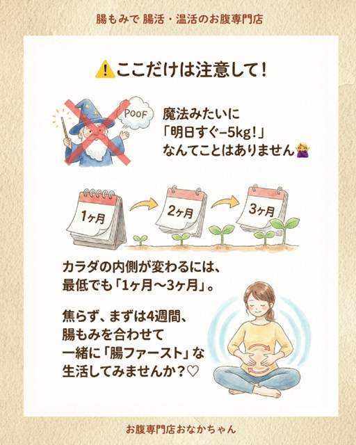 カラダの細胞が入れ替わり、内側の環境が整うまでには、**最低でも「1ヶ月〜3ヶ月」**はかかると言われています。極端なダイエットはリバウンドの元。まずは焦らず、4週間、毎日の食事に「腸が喜ぶもの」をプラスする生活を一緒に続けてみませんか?