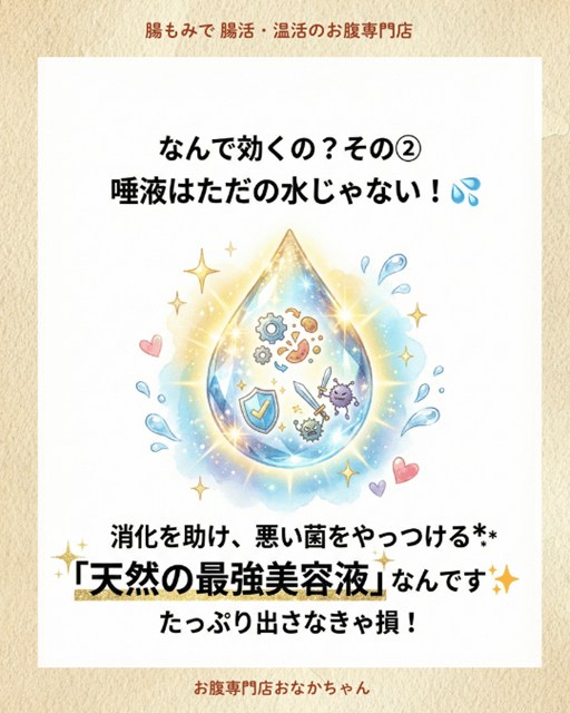よく噛むことで分泌される「唾液」は、ただの水分ではありません。腸と美容にとって重要な成分がたっぷり含まれています。