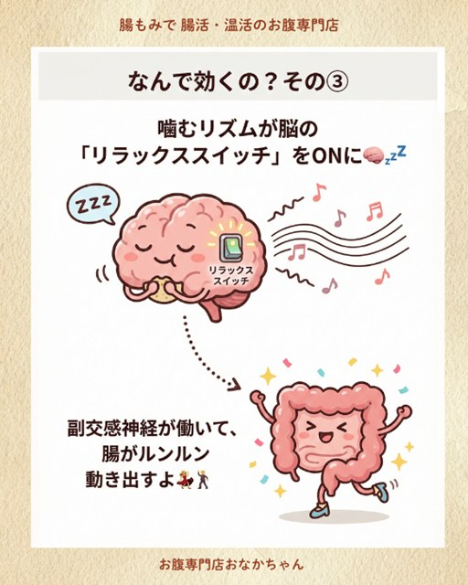 腸の動き(蠕動運動)をコントロールしているのは「自律神経」です。特にリラックスしている時に働く「副交感神経」が優位になると、腸は活発に動きます。