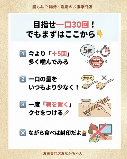 最初から30回を目指すと疲れてしまいます。「いつもよりあと5回多く噛んでから飲み込む」という気楽なルールからスタートしましょう。