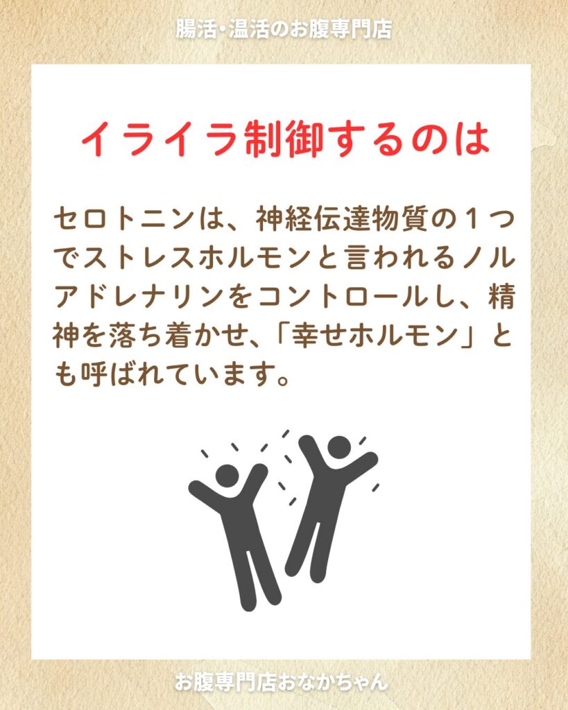 セロトニンは、神経伝達物質の1つでストレスホルモンと言われるノルアドレナリンをコントロールし、精神を落ち着かせ、「幸せホルモン」とも呼ばれています。