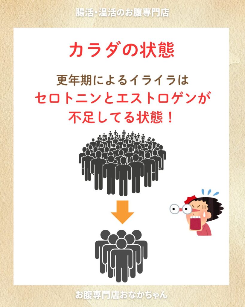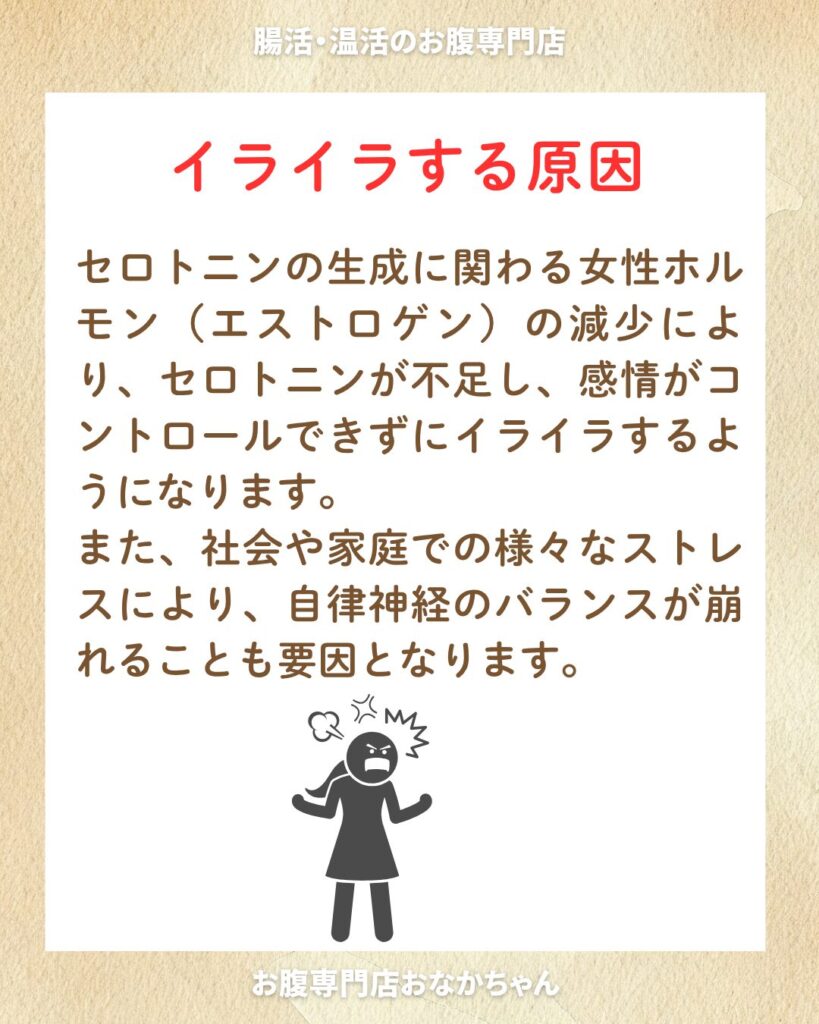 セロトニンの生成に関わる女性ホルモン(エストロゲン)の減少により、セロトニンが不足し、感情がコントロールできずにイライラするようになります。