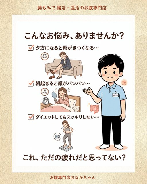 **「大阪 腸もみ」「大阪 腸活」**でお店をお探しの方は、ぜひ私、おなかちゃんのお店にご相談ください。 当サロンでは、服を着たままリラックスできる状態で、優しく丁寧な「腸もみ」を行っています。痛みのない心地よい圧で硬くなったお腹をほぐし、内側からのポカポカ感と巡りをサポートします。
