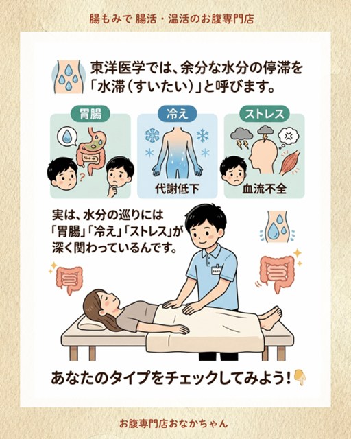 ただの疲れや水分補給のしすぎだと思われがちですが、実は東洋医学の考え方では、水分の巡りには**「胃腸の弱り」「冷え」「ストレス」**が深く関わっているとされています。