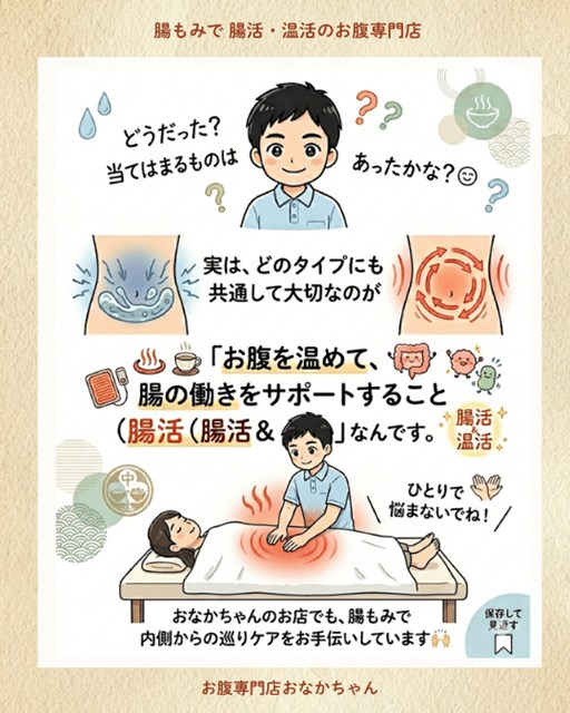 実は、これら4つのタイプすべてに共通して大切なアプローチがあります。それが、**「お腹を温めて、腸の働きをサポートすること(腸活&温活)」**なんです。