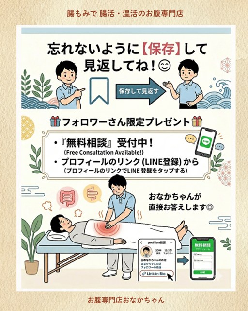 そんな疑問や不安がある方に向けて、現在プロフィールのリンク(LINE登録)から**『無料相談』**をプレゼント中です!おなかちゃんが直接、あなたのお悩みに優しく寄り添ってお答えします◎
