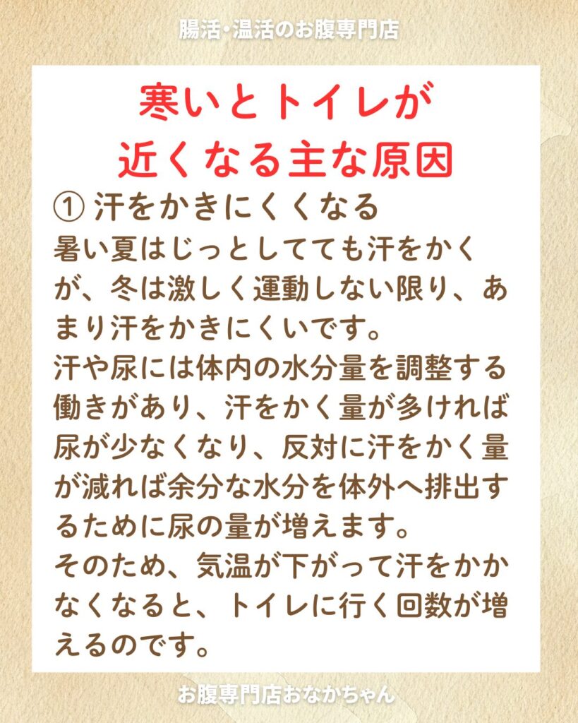 そのため、気温が下がって汗をかかなくなると、トイレに行く回数が増えるのです。