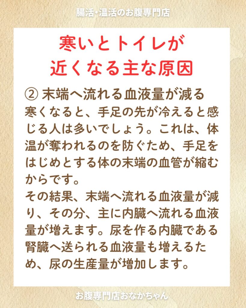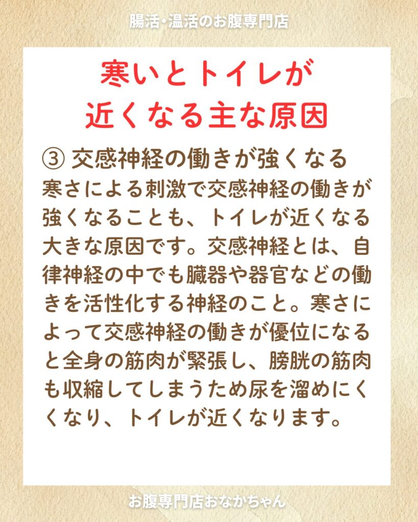寒さによる刺激で交感神経の働きが強くなることも、トイレが近くなる大きな原因です。交感神経とは、自律神経の中でも臓器や器官などの働きを活性化する神経のこと。寒さによって交感神経の働きが優位になると全身の筋肉が緊張し、膀胱の筋肉も収縮してしまうため尿を溜めにくくなり、トイレが近くなります。