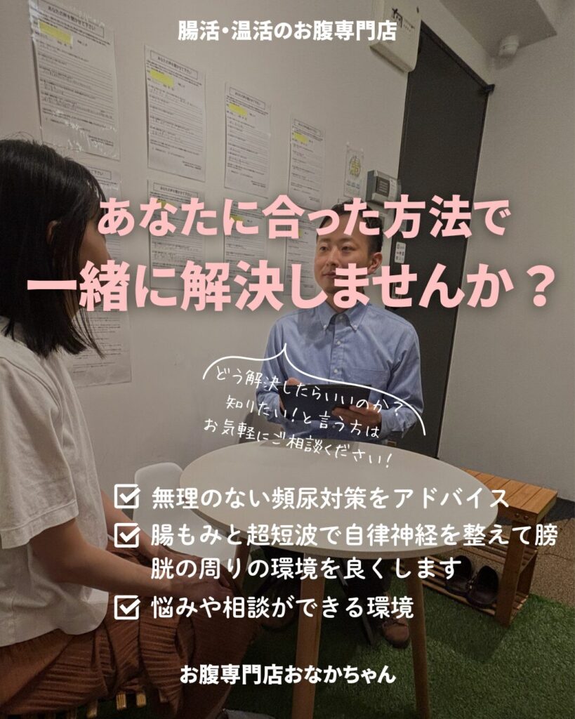 お腹の状態や症状に合わせた腸もみや超短波などのケアできることなどを提案させて頂きます。