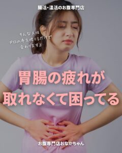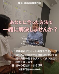 ― ― ― ― ― ― ― ― ― ― ― ― ― ― ― 皆さん、お腹やカラダのお困り事はありませんか? 基礎代謝を上げたい方や 【腸もみで腸活・温活のお腹専門店おなかちゃんのお店ではたくさんの人の悩みや相談を受け付けています!】 あなたの「こんな症状があり、悩んでいたり困っている!」という悩みや相談をお気軽にご連絡ください! お腹の状態や症状に合わせた腸もみや超短波などのケアできることなどを提案させて頂きます。 ■腸もみで腸活・温活のお腹専門店おなかちゃん公式LINEアカウント ■腸もみで腸活・温活のお腹専門店おなかちゃんホットペッパービューティー ― ― ― ― ― ― ― ― ― ― ― ― ― ― ― 当店は赤ちゃんからご高齢の方まで 腸もみで腸活・温活のお腹専門店おなかちゃん