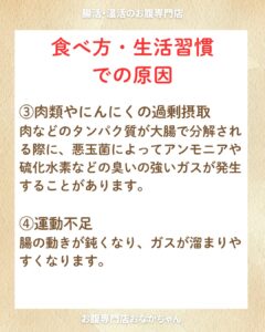 肉などのタンパク質が大腸で分解される際に、悪玉菌によってアンモニアや硫化水素などの臭いの強いガスが発生することがあります。