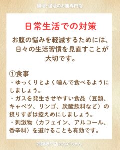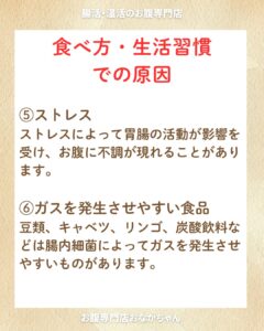 ・ガスを発生させやすい食品(豆類、キャベツ、リンゴ、炭酸飲料など)の摂りすぎは控えめにしましょう。