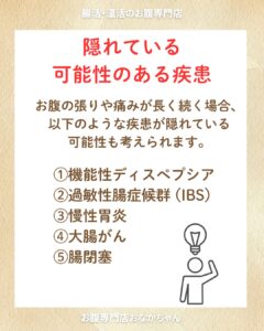 お腹の張りや痛みが長く続く場合、以下のような疾患が隠れている可能性も考えられます。