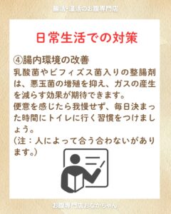 乳酸菌やビフィズス菌入りの整腸剤は、悪玉菌の増殖を抑え、ガスの産生を減らす効果が期待できます。