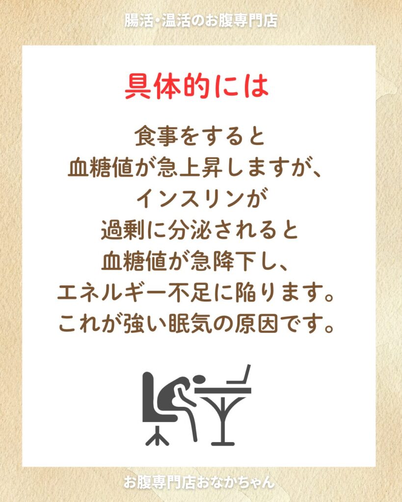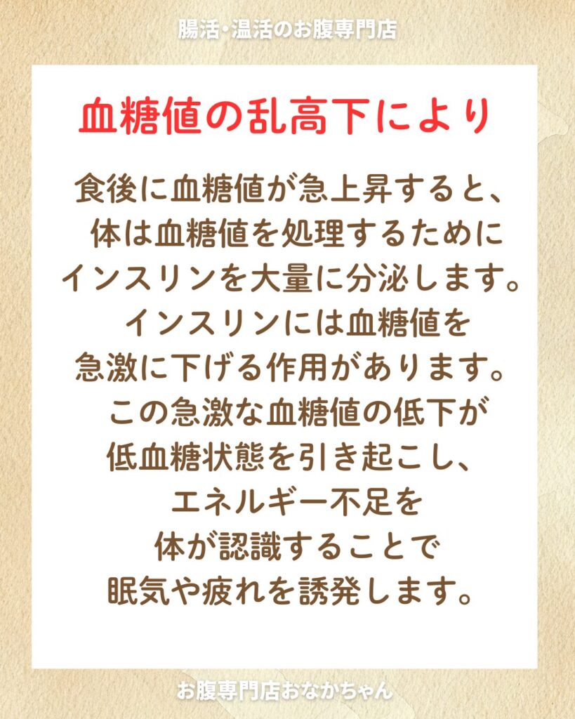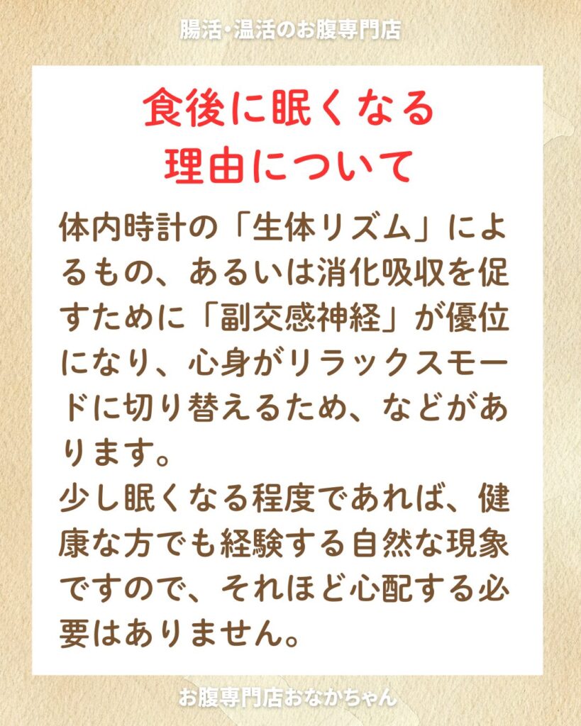 体内時計の「生体リズム」によるもの、あるいは消化吸収を促すために「副交感神経」が優位になり、心身がリラックスモードに切り替えるため、などがあります。