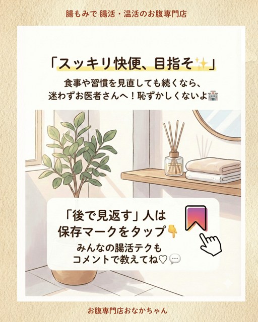 食事や生活を見直しても改善しない、粘液や血が混じる、残便感が強いといった場合は、自己判断せずに消化器内科や肛門科を受診してください。