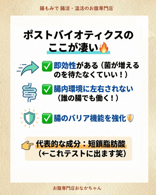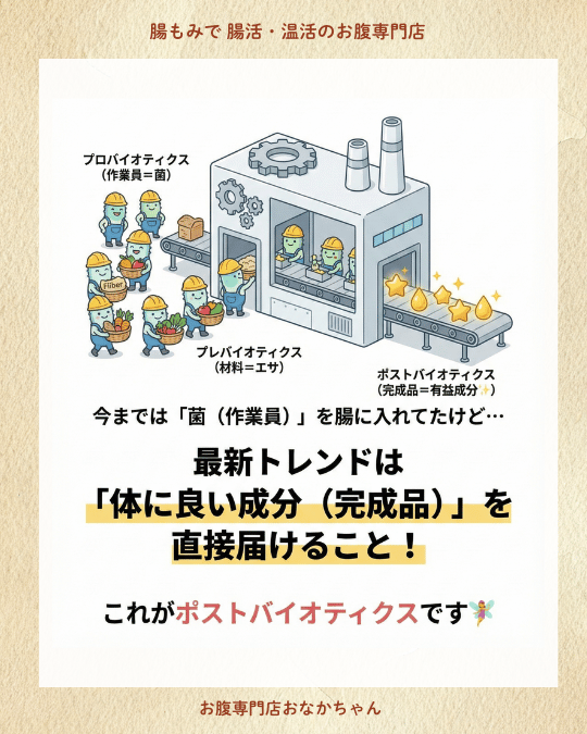 つまり、これまでは「作業員を派遣して、腸の中で製品を作ってもらおう」としていたのを、**「最初から完成品(製品)を直接届けちゃおう!」**というのがポストバイオティクスの考え方なんです。