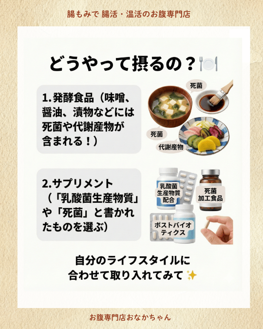 • ポストバイオティクス(製品✨):作業員が材料を使って作り出した**「体に良い完成品」**