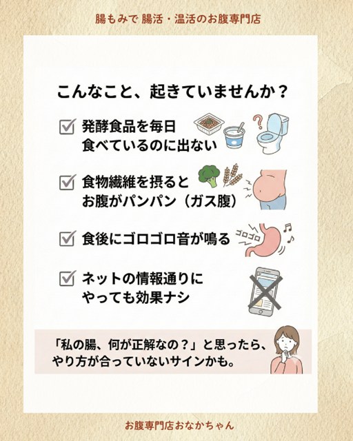 良かれと思って腸活(発酵食品や食物繊維の摂取)をしているのに、かえって不調になったり、何をしても改善しなかったりする状態です。
